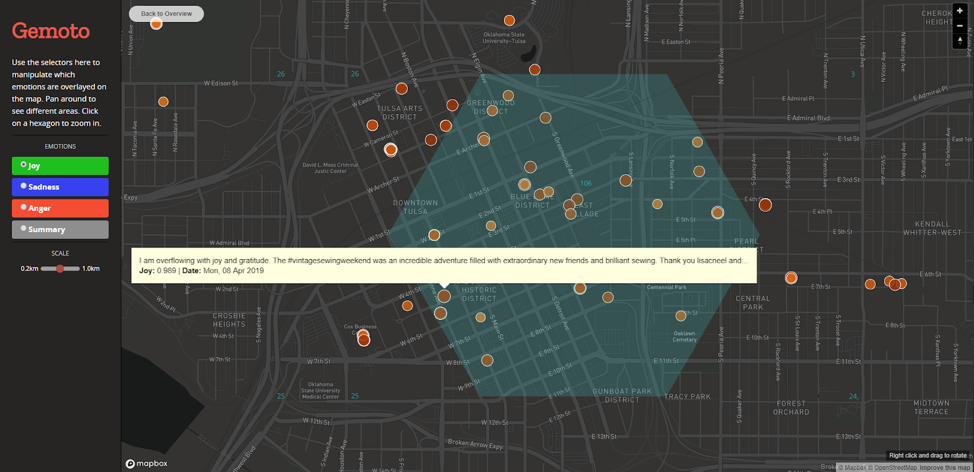 Gemoto is an online visualization tool built to examine human emotions as a spatial dimension of the urban landscape. The tool works in roughly three stages: first, Gemoto scrapes recent geocoded tweets from Twitter and adds them to its library. Next, new tweets are parsed by IBM’s Watson tone analyzer and given a numeric score which represents the presence or absence of certain emotions, such as Joy, Anger, or Sadness. Finally, Gemoto aggregates the data and displays the levels of these emotions as hexbins across a front-end map. Any hexbin can be clicked on to zoom in and get a fine-grain look at exactly how people are tweeting (and emoting) in that area.