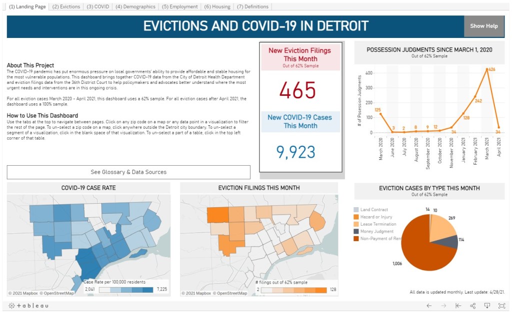 Eviction has serious consequences on an individual’s health and material well-being, and during the COVID-19 pandemic, eviction has also had serious implications for public health— with some studies estimating that national moratoria on evictions and public utility disconnections between March and November 2020 could have reduced COVID-19 deaths by over 40%. Detroit had a high eviction rate relative to cities of similar size even before the pandemic, and its residents face additional economic and other factors that increase eviction and COVID-19 risk. To further study these overlapping crises and provide timely data that can help the City of Detroit and various housing advocacy organizations mitigate their effects, this project created an online data dashboard tracking eviction and COVID-19. This dashboard will continue to be updated with the latest data for the duration of the pandemic.