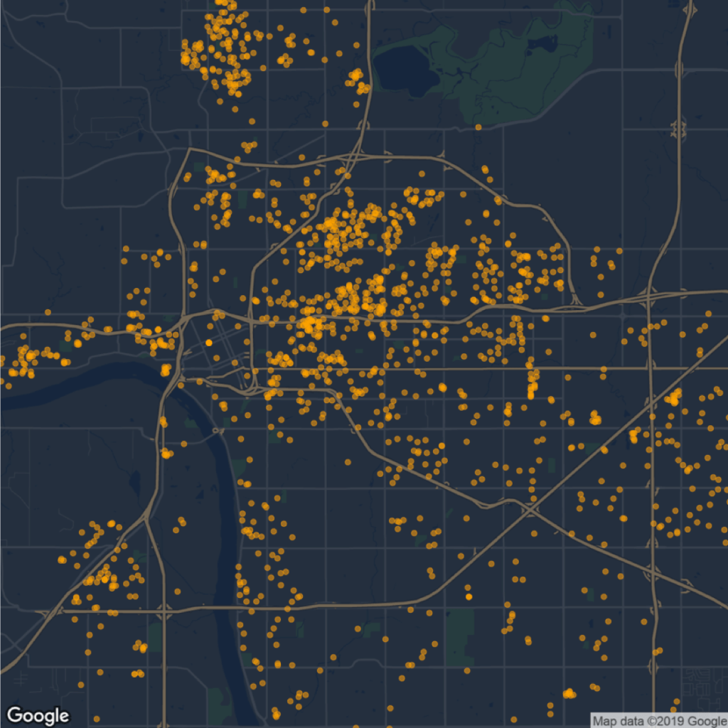 Using an extensive public dataset of water meter billing data, in combination with county court data scraped by the Oklahoma Policy Institute, I implemented a method for predicting where evictions among single-family housing units most likely occurred in Tulsa from 2009-2019. The results of this data analysis can be seen at right, where each dot corresponds to a parcel which was predicted to have been evicted at least once during the 10-year period.